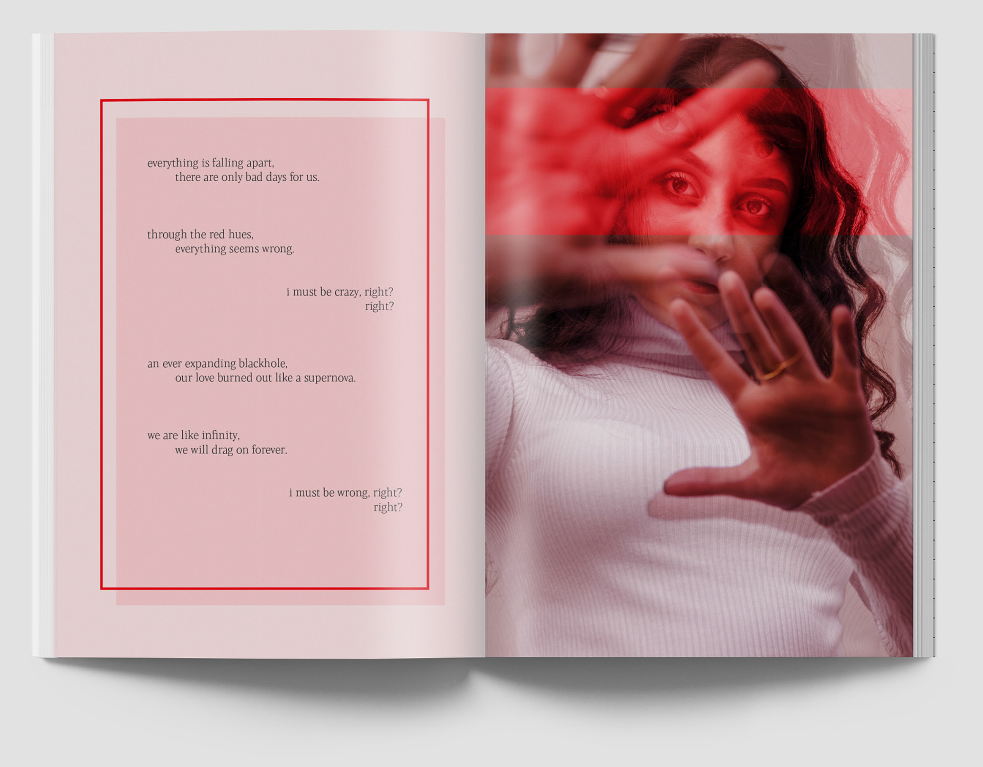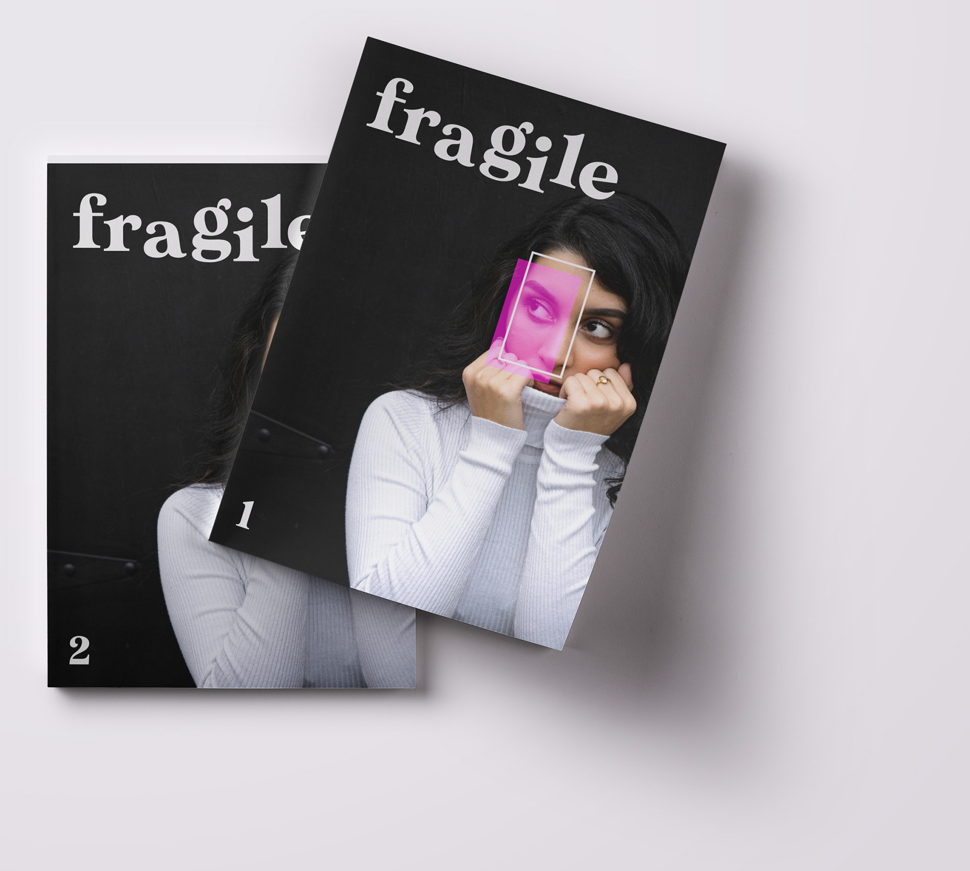 Fragile is a project based on the everyday vulnerability that humans feel. The colour series is a three part zine that reflect three different stages of love and of being in a relationship. The first zine is based on the colour pink – the world through red coloured glasses, the most vulnerable stage when one can only see the good in their partner. The second zine is based on the colour red – when one finally identifies the red flags that can appear during the relationship. The third and last zine is about the colour blue – the sadness and grief of ending a relationship and losing someone who was once so close.