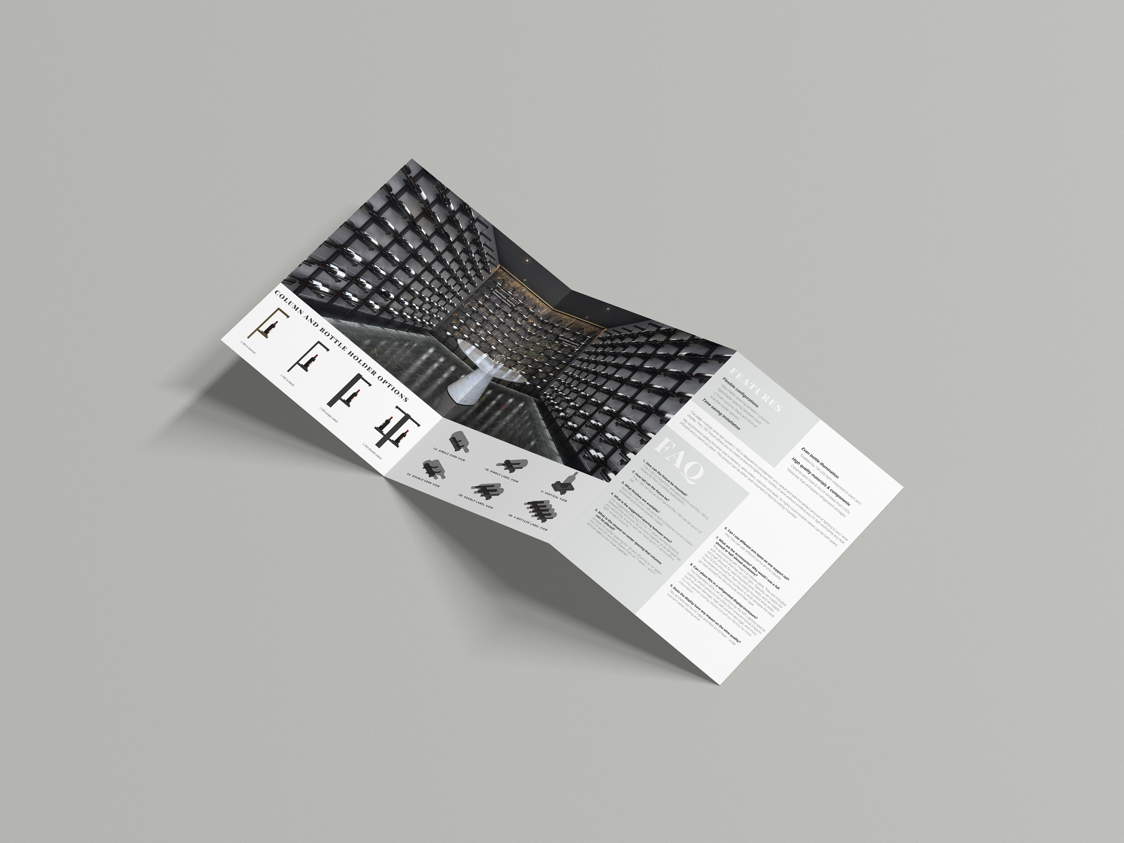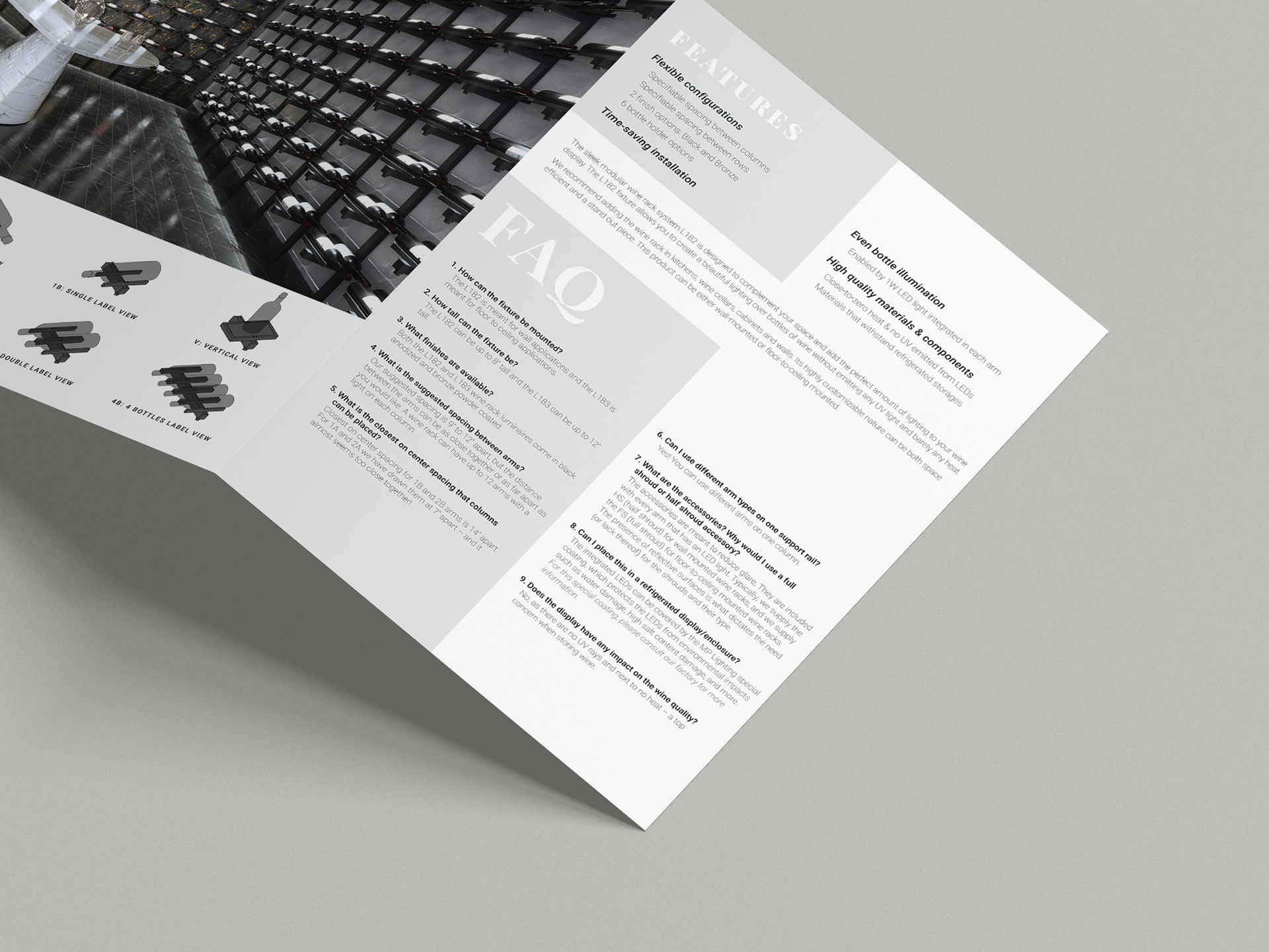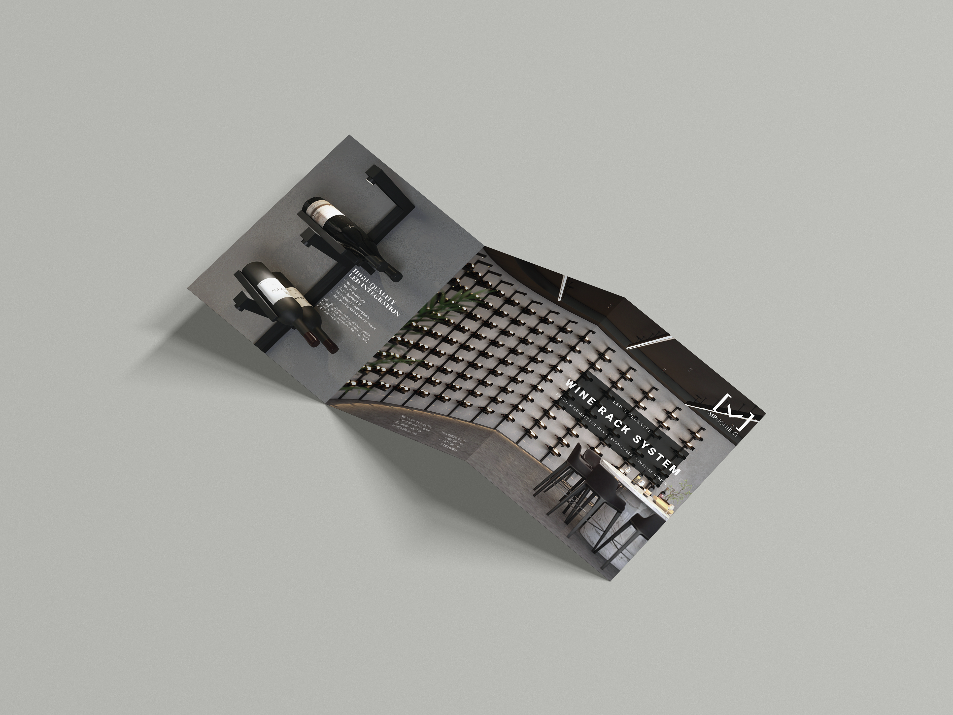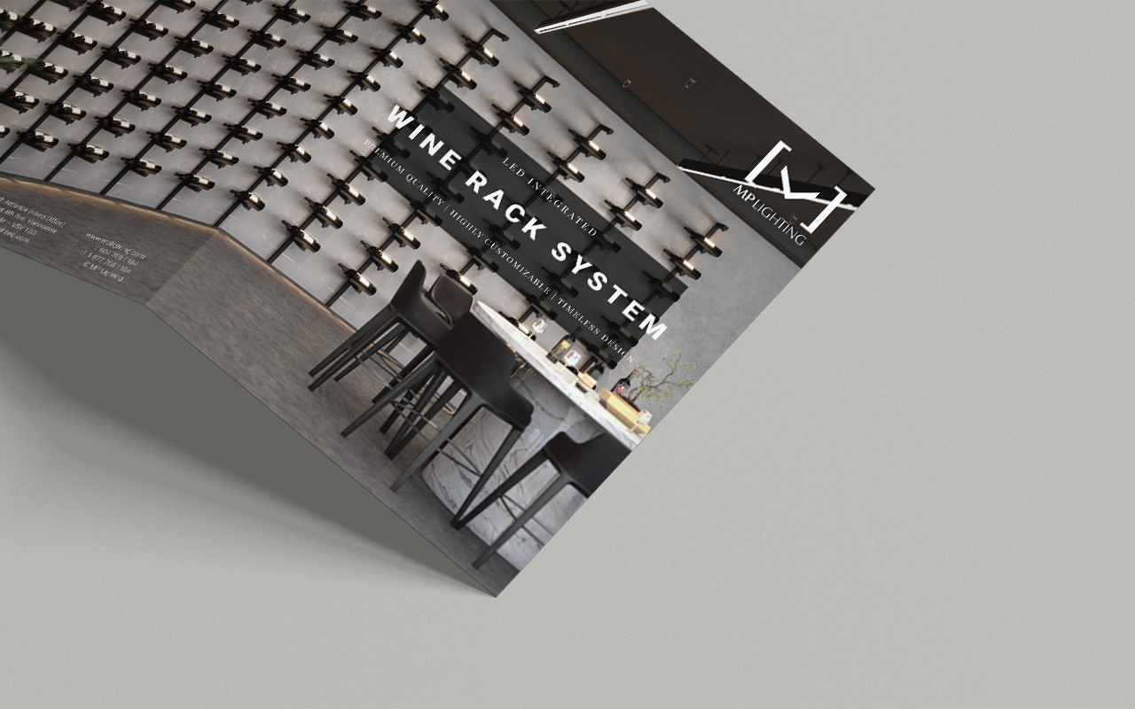 In order to promote MP Lighting’s latest technological advancement in lighting fixtures, I designed, wrote copy, typeset, and printed a trifold brochure to promote the LED-integrated wine rack systems.
