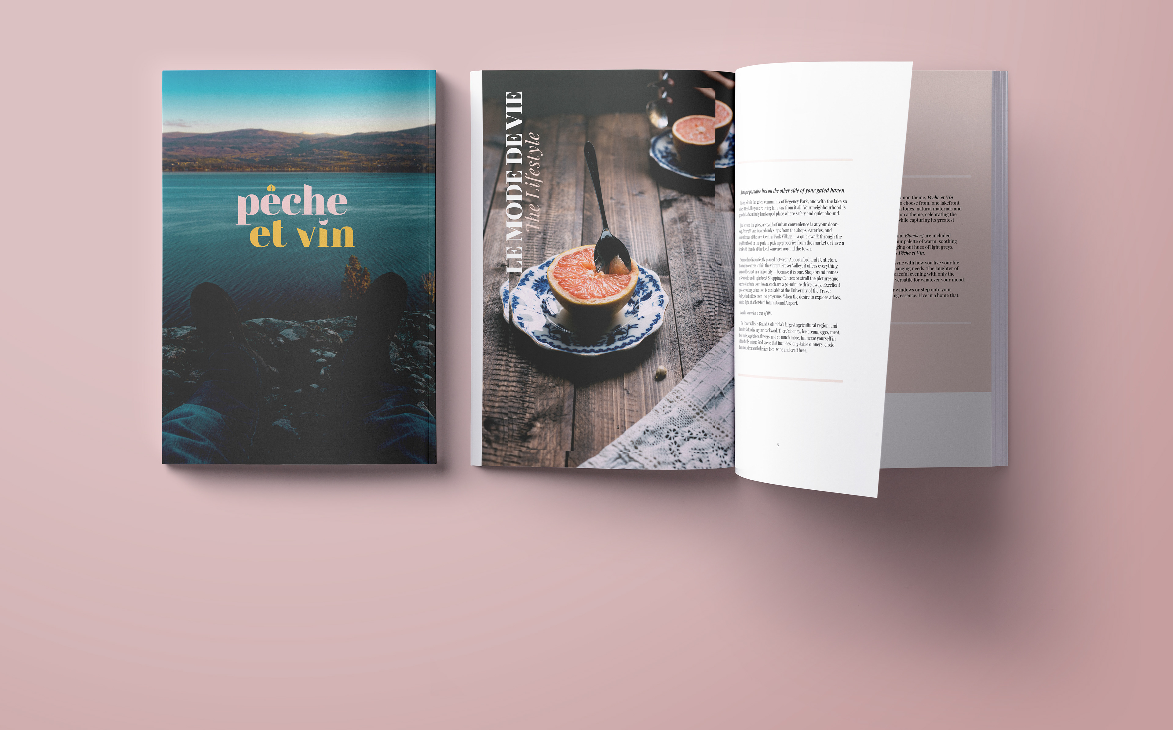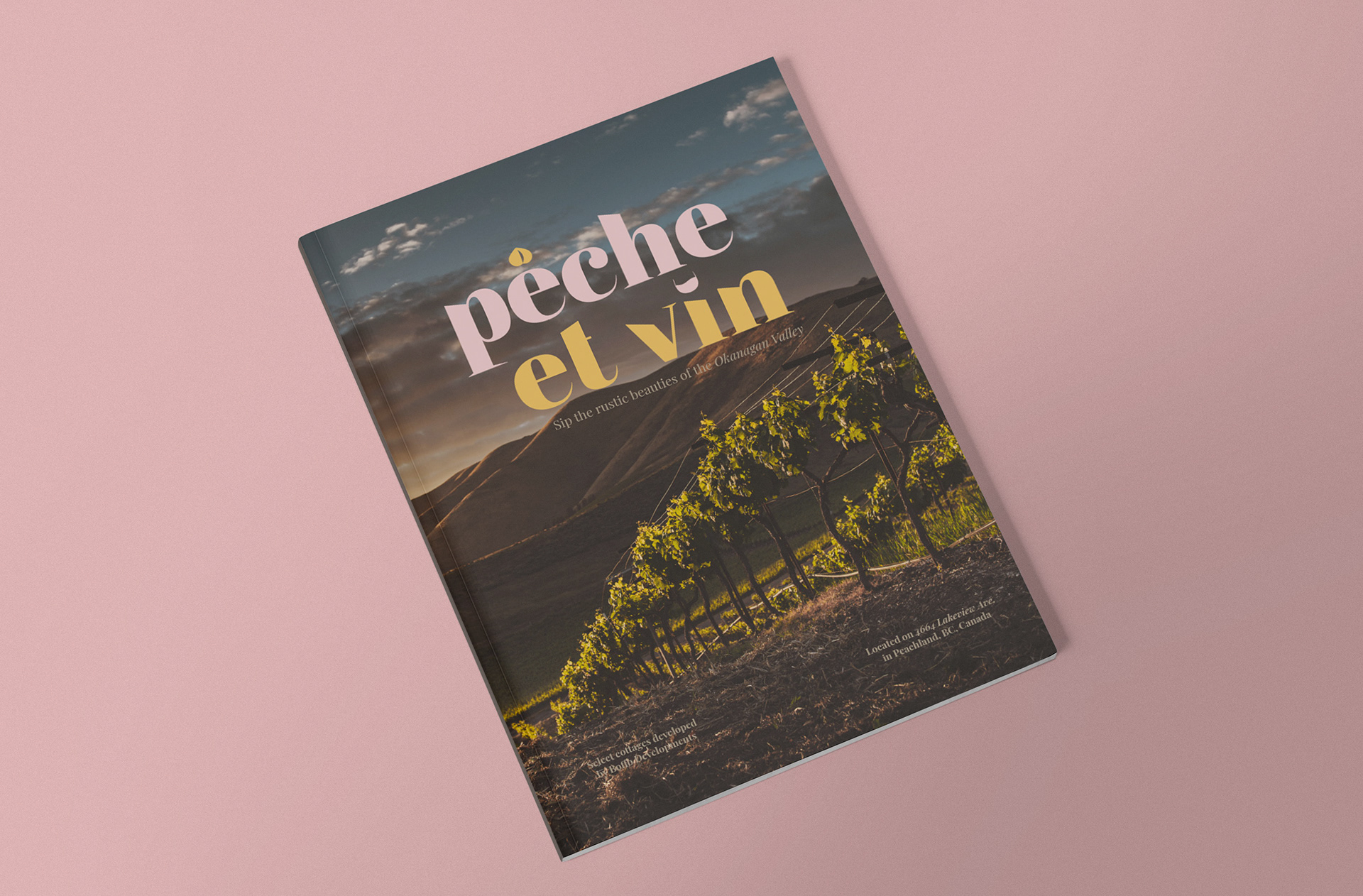 Peche et Vin is a conceptual condo brochure inspired by southern France and its many wineries. Peche et Vin is based in the Okanagan Lake, more specifically Peachland. The name, “peach and wine” reflects the location of the condo, and it being in French reflects the inspiration behind the condo itself, with an elevated southern French farmhouse aesthetic. The colour palette is very light, with pink and yellow being centre stage, while a warm brown balances the brighter pinks and yellows. The typography is inspired by the French Rococo style but modernized, the sharp edges of the logo contrast with the softer, rounder typefaces in the booklet.