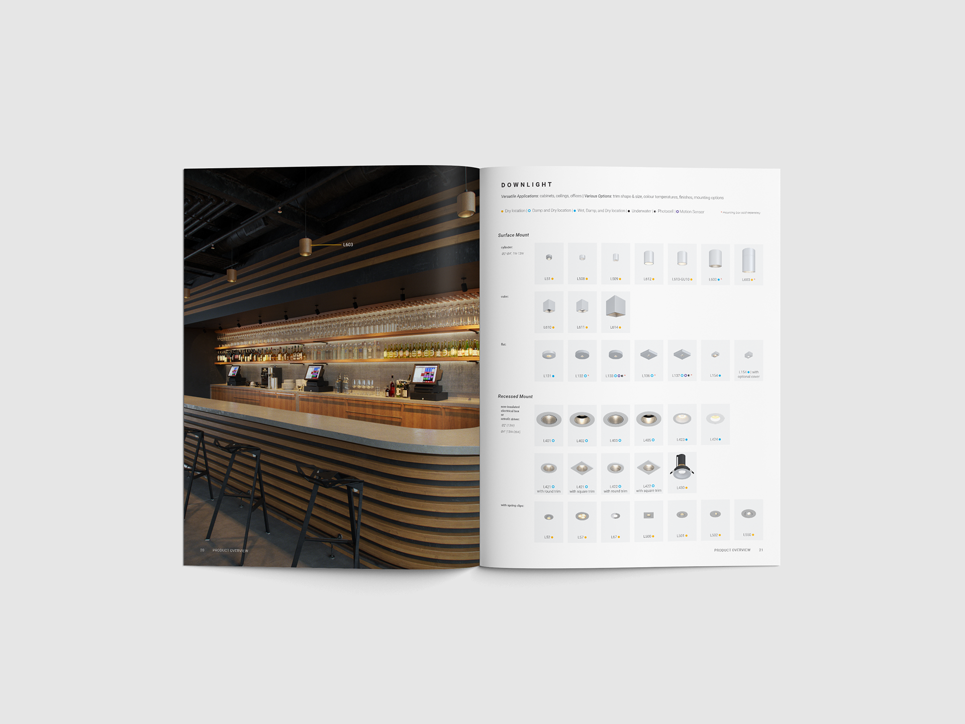 MP Lighting’s portfolio of over 200 LED fixtures required an updated Product Overview Catalogue featuring their entire lineup, which spans across 14 categories in total.
